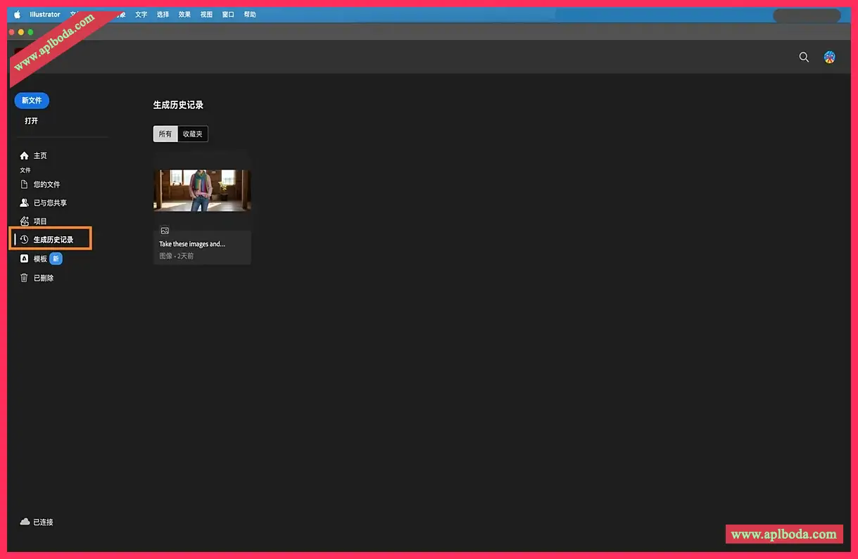 您可以从 Illustrator 主屏幕或工作区访问生成历史记录 ,以处理您在 Firefly 网站上生成的光栅图像——无需下载和上传。