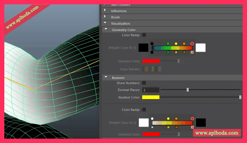 以前在 Maya 中,无法在视口中以数字形式查看精确权重值。现在,绘制蒙皮权重工具(Paint Skin Weights Tool)中的新“权重可视化”(Weights Visualization)设置允许您以数字方式显示权重影响,从而提供一种精确的方式来查看权重对周围关节的影响。