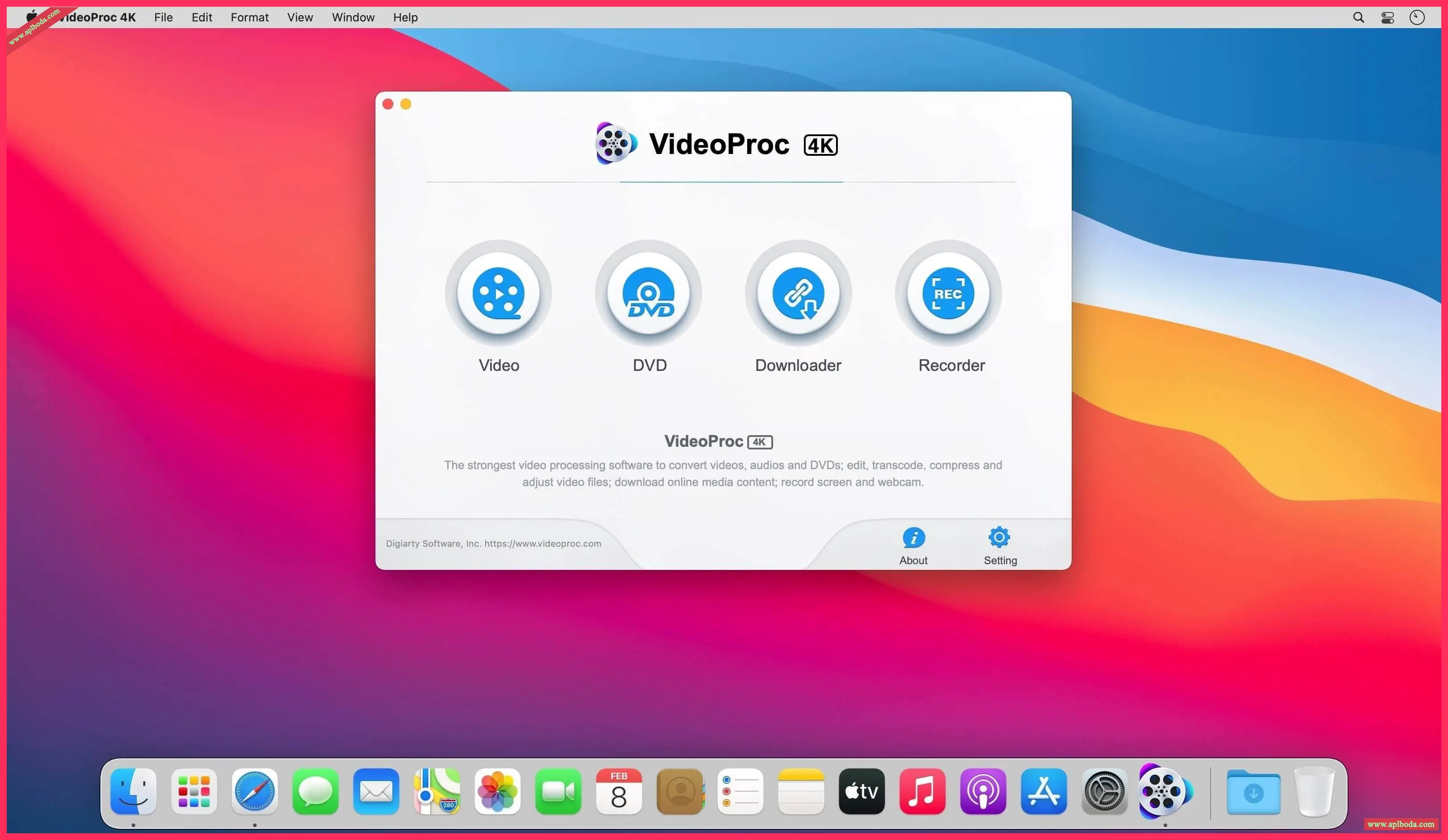 VideoProc可协助你分割、剪辑、修剪、旋转、翻转、合并影片片段,将多声道、字幕轨道设定进一个MKV档案,添加浮水印或字幕档案,快速套用程式内建的滤镜特效,调整影片画面色彩(如画面亮度、对比度、色调、gamma值、饱和度)。这款影片剪辑软体亦能消除或降低GoPro影片的画面抖动、噪音,修复鱼眼变形,制作GIF动画,抓取画面快照,支援3D影片转为2D影片,或者把影片转为M3U8。