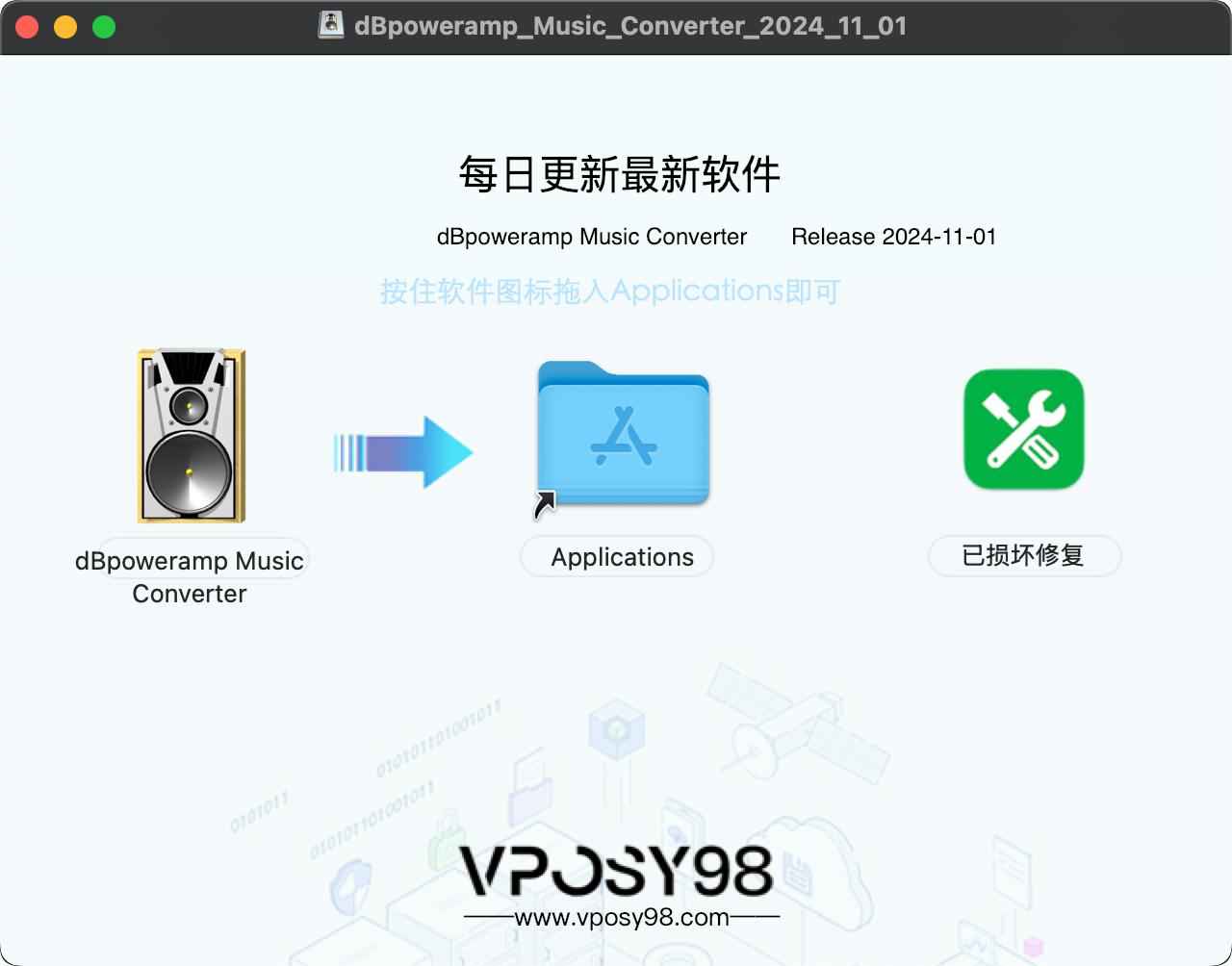 安装包下载完成后打开,拖动左侧的软件到右侧应用程序中即可!