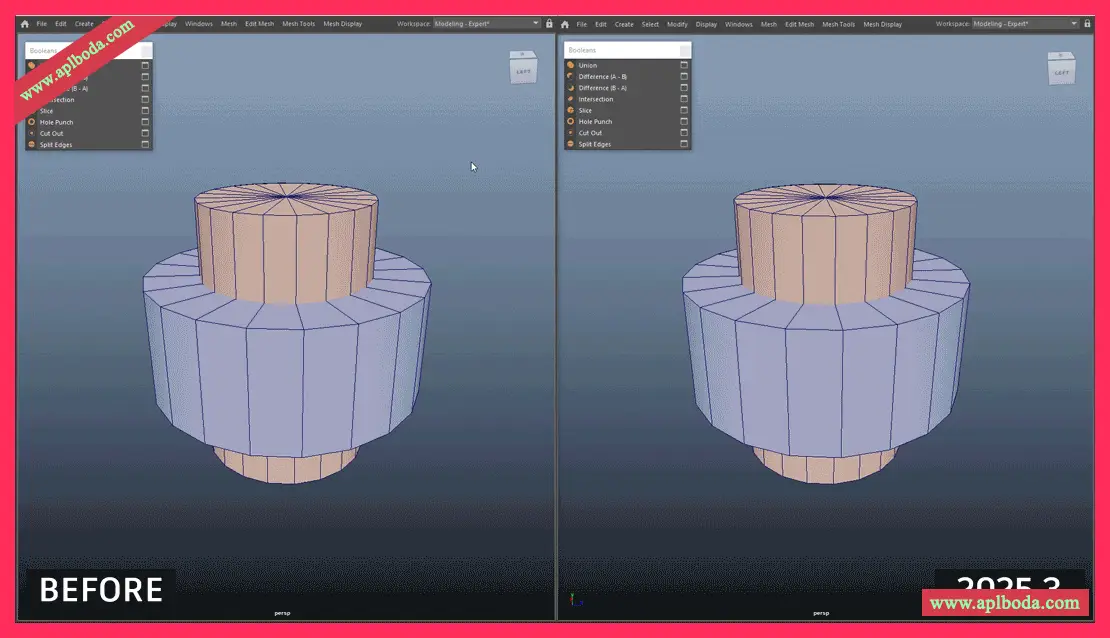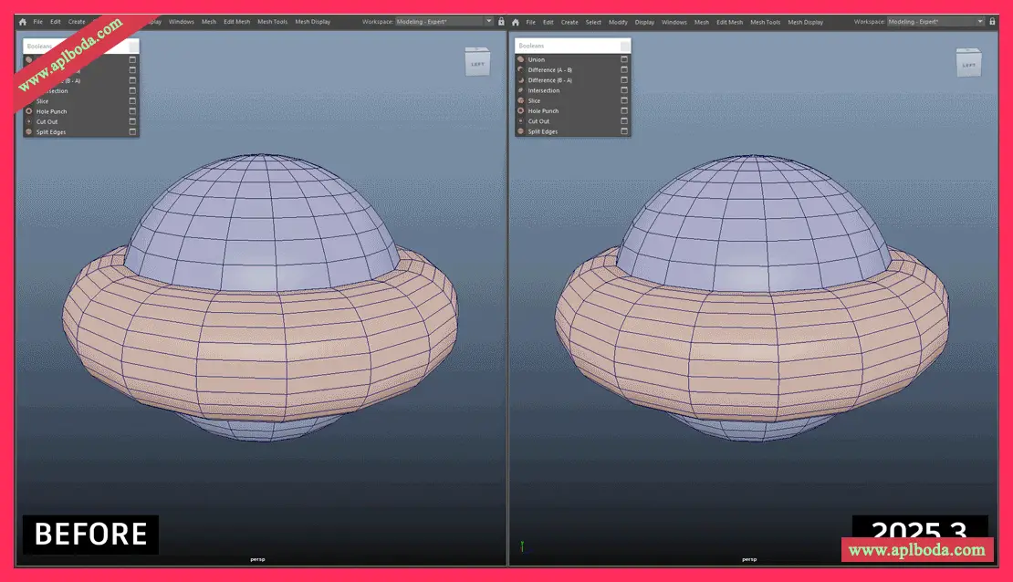 布尔算法已更新,以与3ds Max保持一致。这使Maya和3ds Max之间实现了共享的统一核心布尔引擎。通过这次更新,布尔值的可预测性和可靠性得到了提高。
