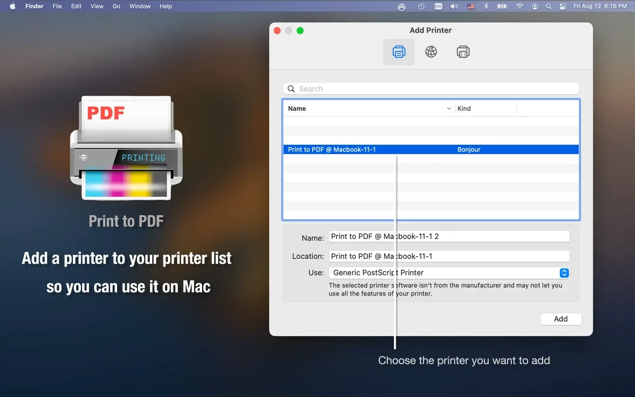 这个应用程序在网络上作为一个小型无线打印机服务器运行,因此您可以在系统偏好设置中将其添加到我们的 mac,并将任何文档直接打印为 pdf。