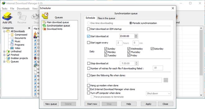 互联网下载管理器可以在设定的时间连接到互联网,下载您想要的文件,断开连接,或在完成后关闭您的计算机。您还可以使用文件的定期同步来同步更改。可以为下载或同步创建和安排几个下载队列。