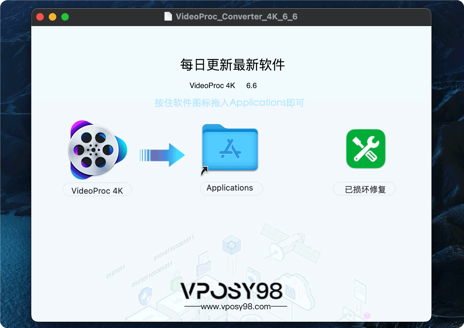 下载完成后,拖动左侧的VideoProc4K到右侧应用程序中即可