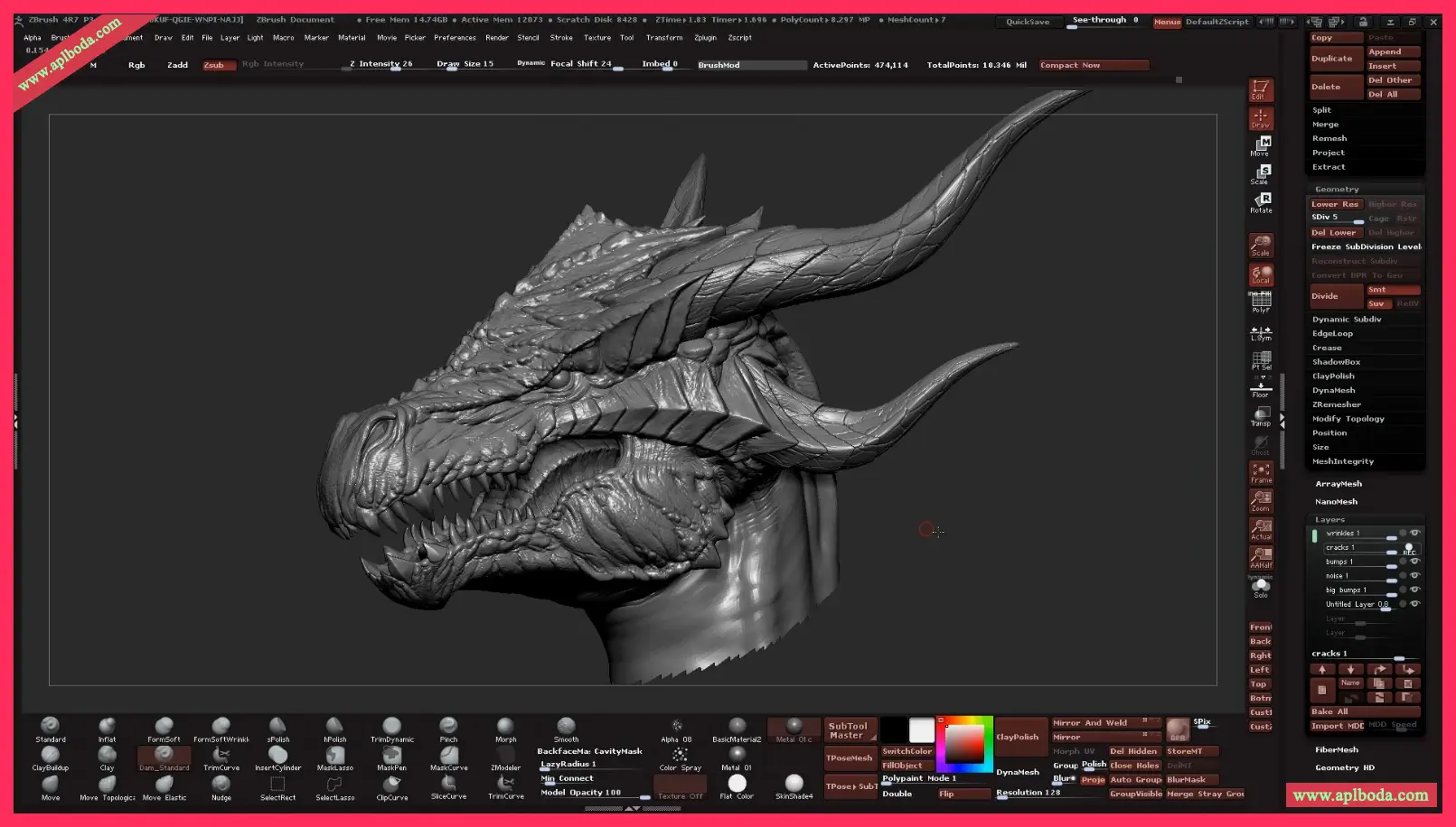 它将三维动画中间最复杂最耗费精力的角色建模和贴图工作,变成了小朋友玩泥巴那样简单有趣。设计师可以通过手写板或者鼠标来控制ZBrush 的立体笔刷工具,自由自在地随意雕刻自己头脑中的形象。至于拓扑结构、网格分布一类的繁琐问题都交由 Zbrush 在后台自动完成。他细腻的笔刷可以轻易塑造出皱纹、发丝、青春痘、雀斑之类的皮肤细节,包括这些微小细节的凹凸模型和材质。令专业设计师兴奋的是,ZBrush 不但可以轻松塑造出各种数字生物的造型和肌理,还可以把这些复杂的细节导出成法线贴图和展好 UV 的低分辨率模型。这些法线贴图和低模可以被所有的大型三维软件 Maya、Max、Softimage|Xsi、Lightwave 等识别和应用。成为专业动画制作领域里面最重要的建模材质的辅助工具。
