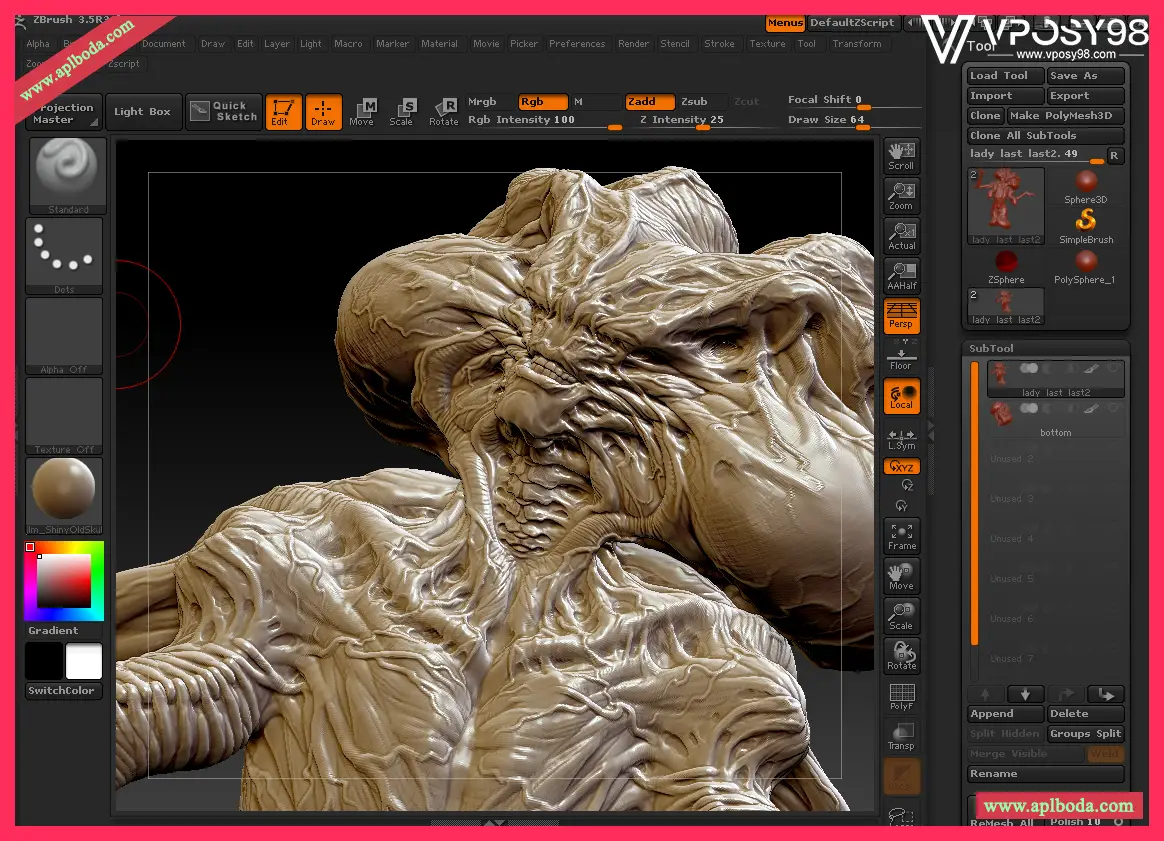 ZBrush 2026  是一个数字雕刻和绘画软件,它以强大的功能和直观的工作流程彻底改变了整个三维行业。在一个简洁的界面中,ZBrush 为当代数字艺术家提供了世界上最先进的工具。以实用的思路开发出的功能组合,在激发艺术家创作力的同时,ZBrush 产生了一种用户感受,在操作时会感到非常的顺畅。ZBrush 能够雕刻高达 10 亿多边形的模型,所以说限制只取决于艺术家自身的想象力。