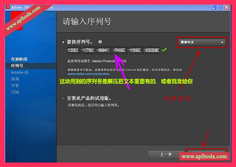 第四步:填好软件包内含的序列号,选择好语言 下一步