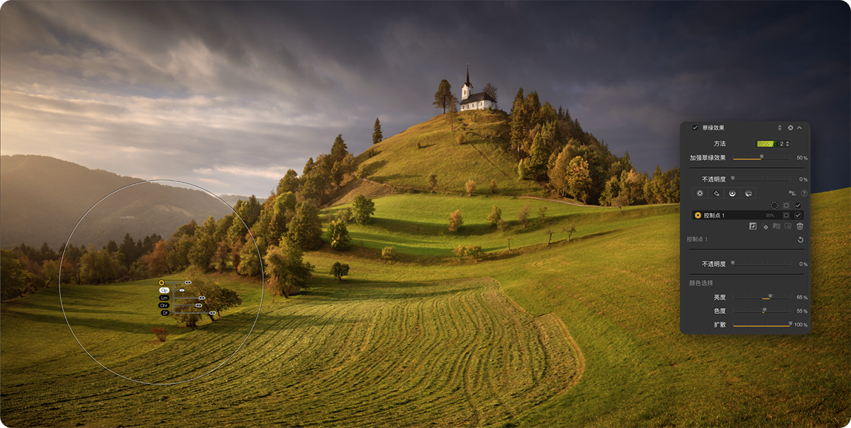 – Leistungsstarkes selektives U-Punkt-Tool zur schnellen Feinabstimmung von Kontrast, Schatten, Struktur und Sättigungsanpassungen.