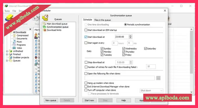 Internet Download Manager can connect to the Internet at a set time, download the files you want, disconnect, or shut down your computer when finished. You can also use scheduled synchronization of files to synchronize changes. You can create and schedule several download queues for downloading or synchronization.