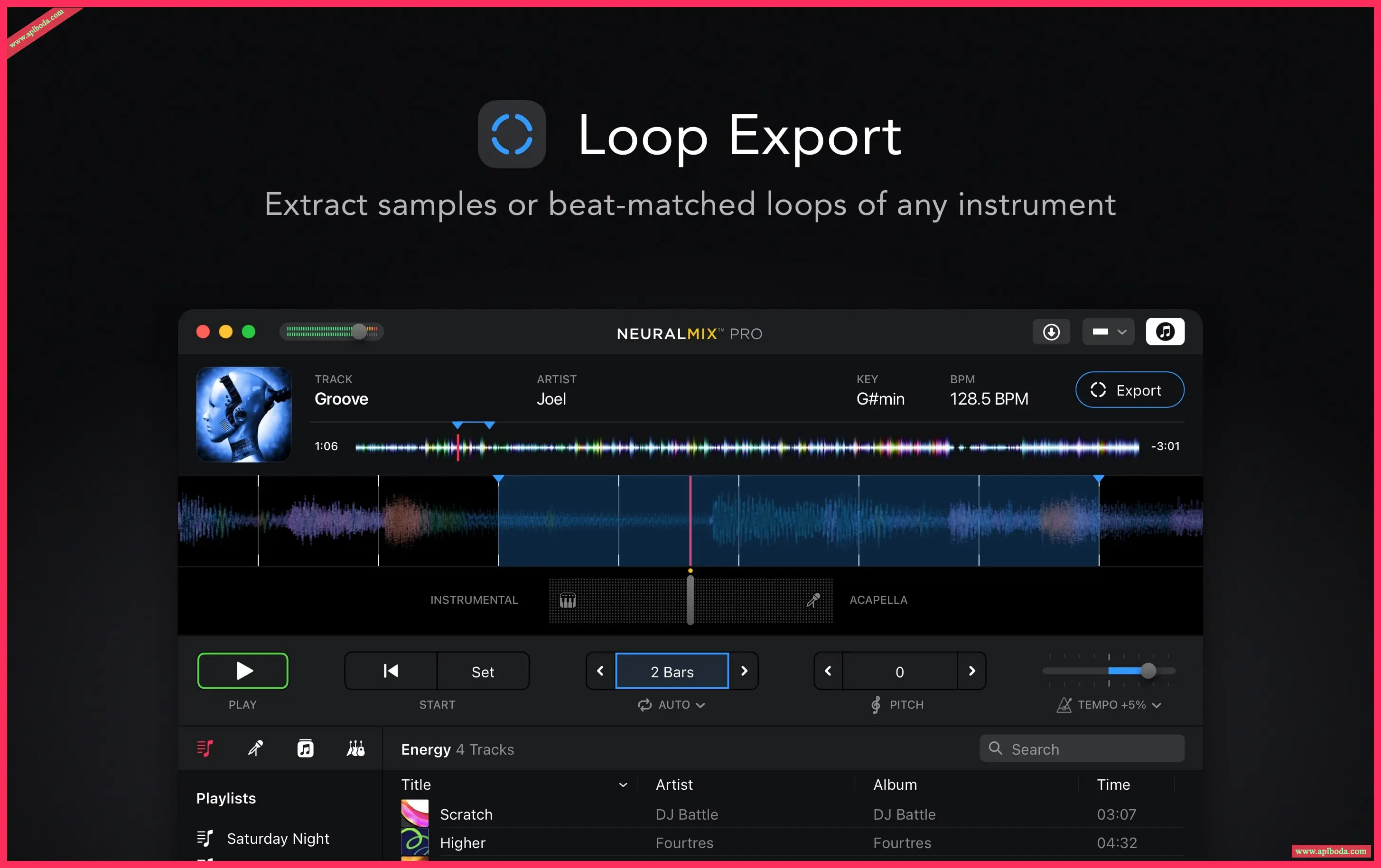 您可以创建节拍精确的循环,更改速度和移调歌曲的键,同时实时删除人声,打击乐或和声部分。先进的离线导出功能使您可以提取原始音质的acappellas和乐器,以便在您喜欢的DJ或音乐制作软件中使用。