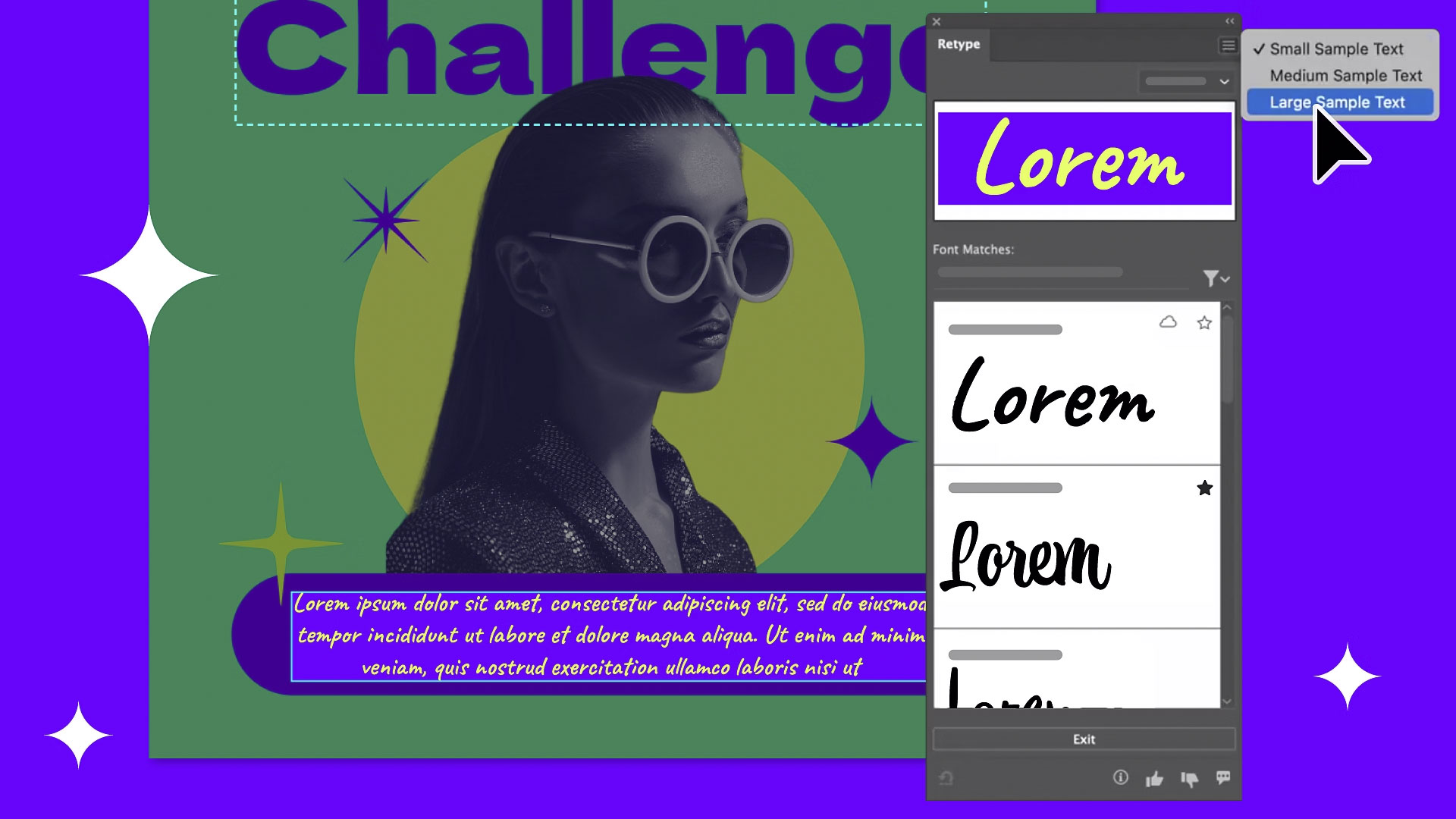 exist Retype In the panel, you can useShow Favorite Fontsfilter to view all suggested fonts that you've marked as favorites. You can also resize the sample text to small, medium, or large using the panel menu.
