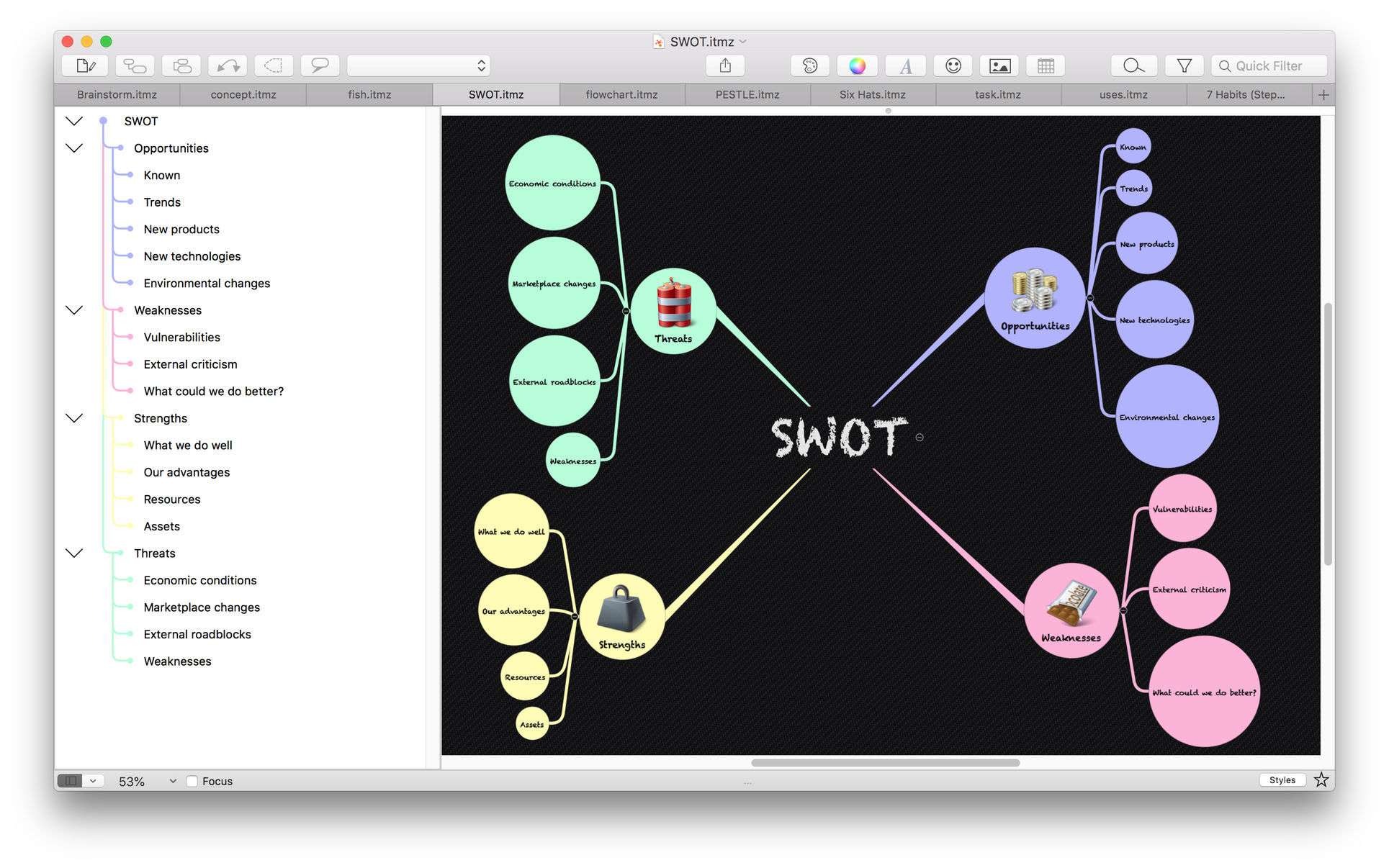 在使用其他工具时,无论它们使用何种格式,您都不会感到任何限制。iThoughtsX 支持所有主要文件格式,包括 .rtf、.txt、Microsoft Word (.docx)、.csv、MindGenius (.mgmx)、MindNode (.mindnode)、.opml 等。即时导入和导出文件,而不会中断您的工作流程。