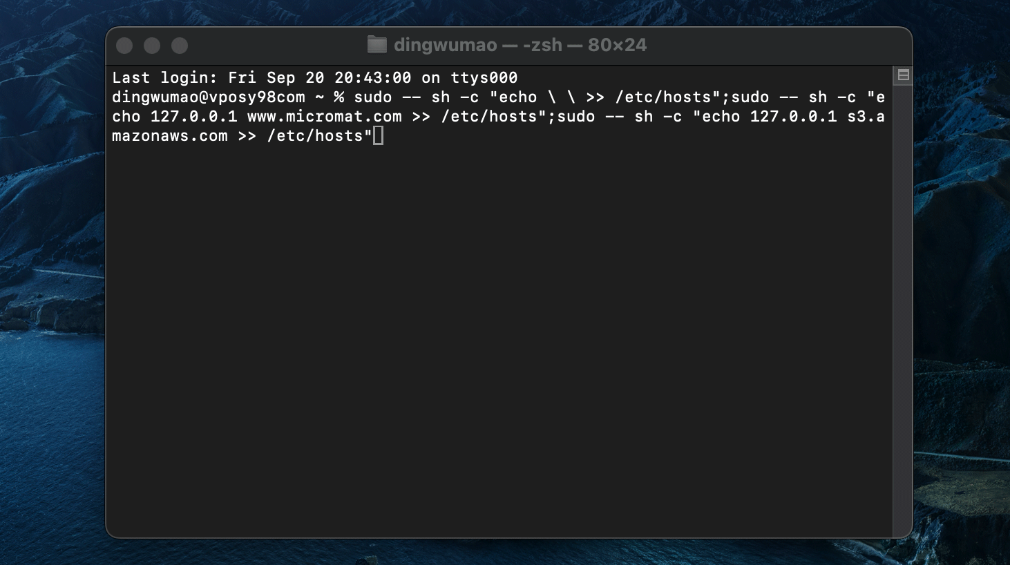 打开终端,将sudo -- sh -c "echo >> /etc/hosts";sudo -- sh -c "echo 127.0.0.1 www.micromat.com >> /etc/hosts";sudo -- sh -c "echo 127.0.0.1 s3.amazonaws.com >> /etc/hosts"复制到终端中回车输入电脑密码