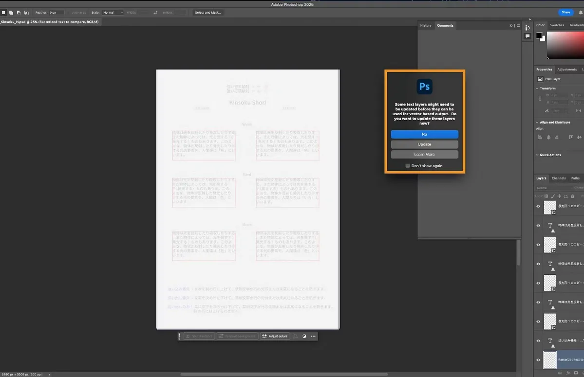 更新文字圖層以利向量輸出,使中文、日文和韓文的文字呈現更銳利、精準。 這也能在開啟以不同Photoshop 版本或不完全一致字體建立的檔案時,提升精準度。