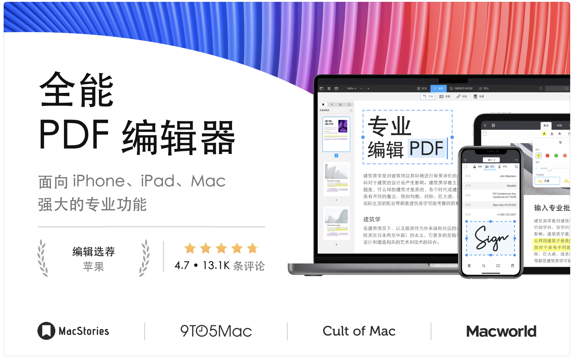 适用于您的所有设备 – 在任何 Apple 设备(Mac、iPad 和 iPhone)上使用 PDF Expert。使用 Apple 的 Continuity 和 Handoff 功能将文档从一台设备无缝传输到另一台设备,并在您离开的地方继续编辑。