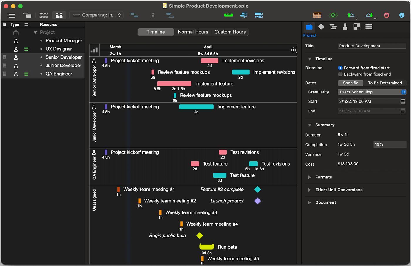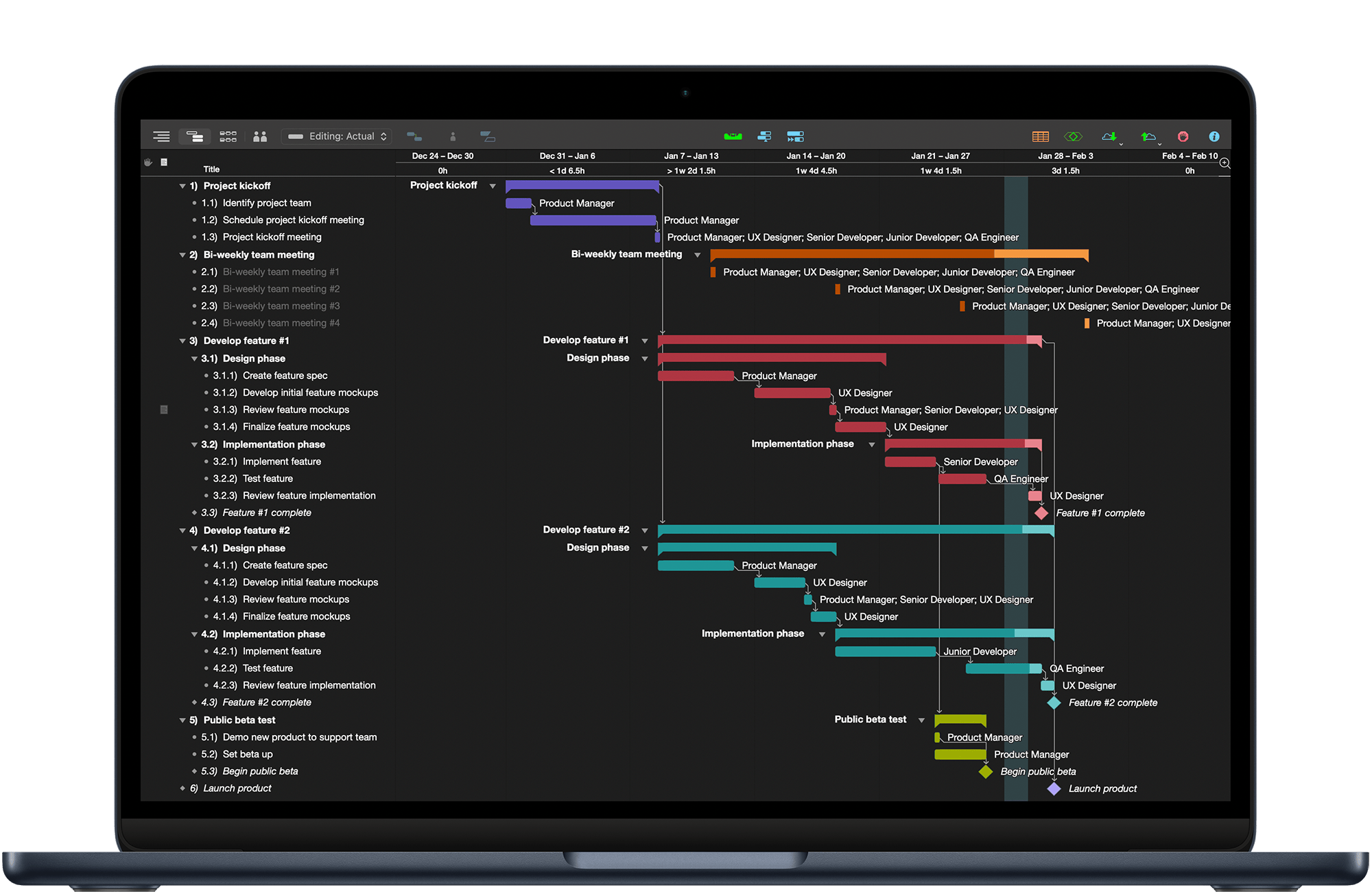 借助 OmniPlan Pro,用户可以轻松地可视化他们的项目时间表和依赖关系、将任务分配给团队成员、监控进度并根据需要进行调整。该软件还集成了其他流行的工具,如 Microsoft Project 和 Excel,并允许用户以多种格式导入和导出数据。