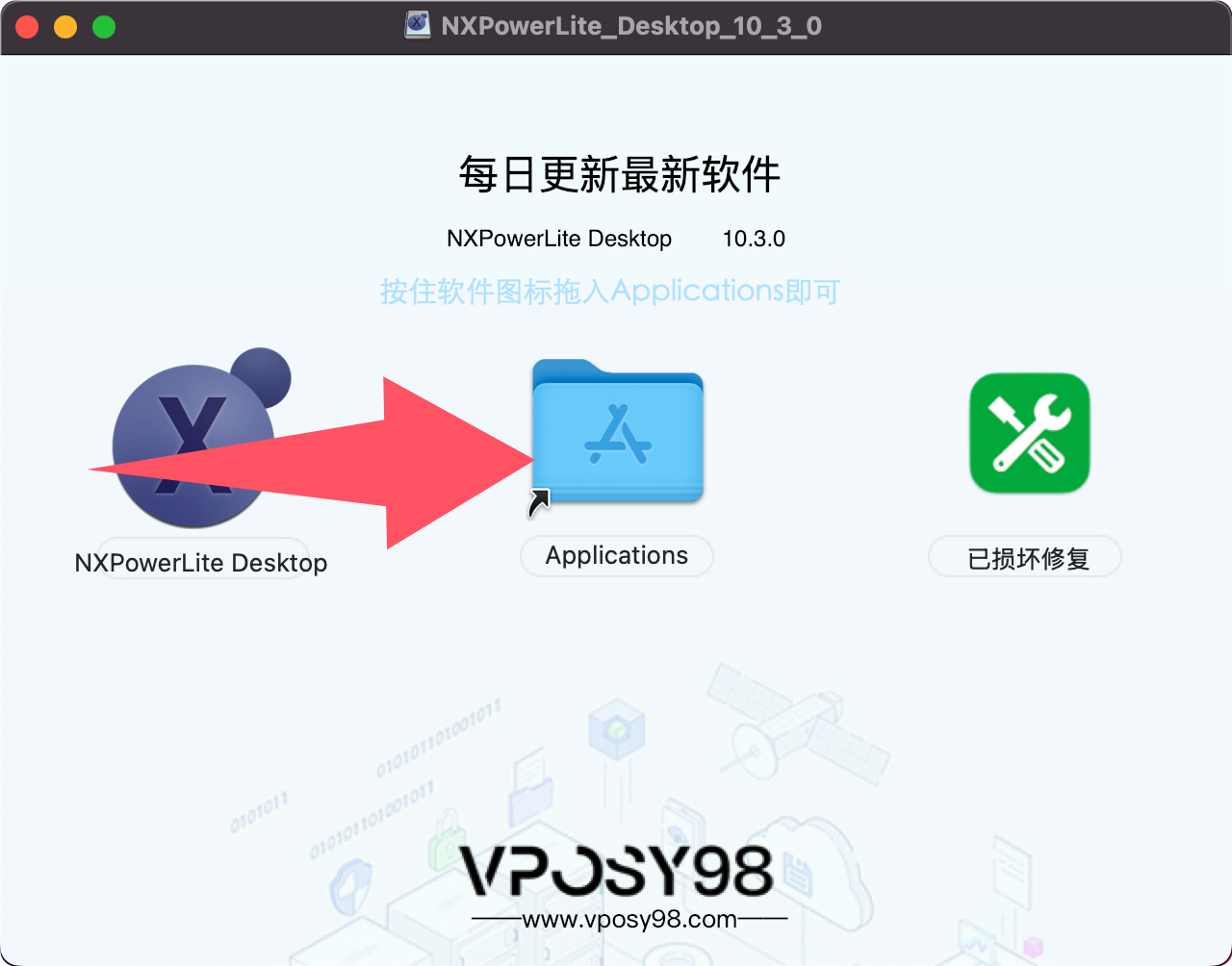 安装包下载完成后,将左侧NXPowerLite Desktop拖动到右侧的应用程序中,即可完成安装。