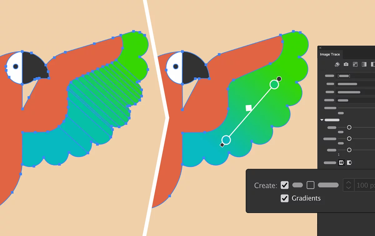 存在するモードでトレースする場合、透明性オプションにより、透明な背景が白としてトレースされるのを防ぎます。またはグレースケールモード、勾配オプションは、設定した強度に基づいて線形グラデーションを検出し、トレースします。トレース後は、勾配 グラデーションを簡単に最適化するツール。
