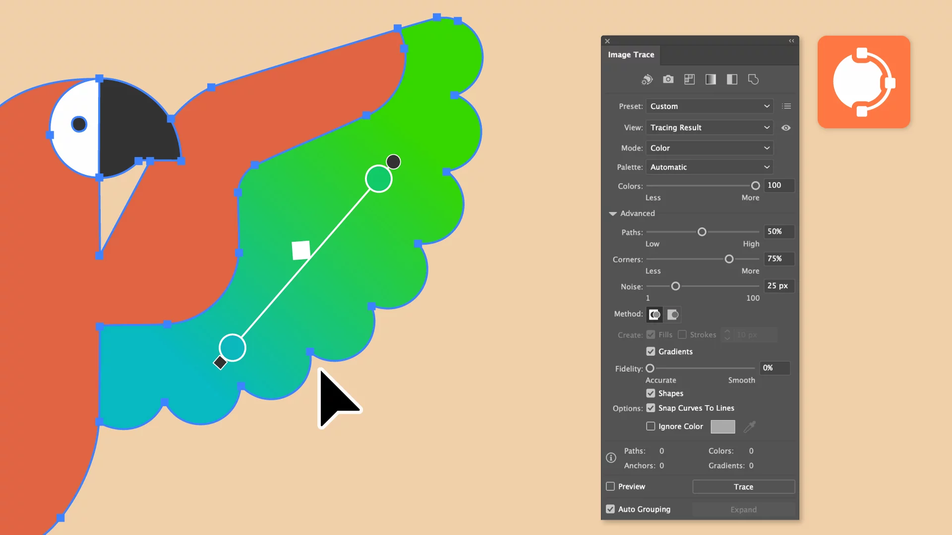 アンカーポイントを少なくし、パスを論理的なグループにまとめる自動グループ化オプションを使用すると、トレース結果の編集が容易になります。さらに、円、正方形、長方形をライブシェイプとしてトレースするオプションにより、編集プロセスがさらに効率化されます。