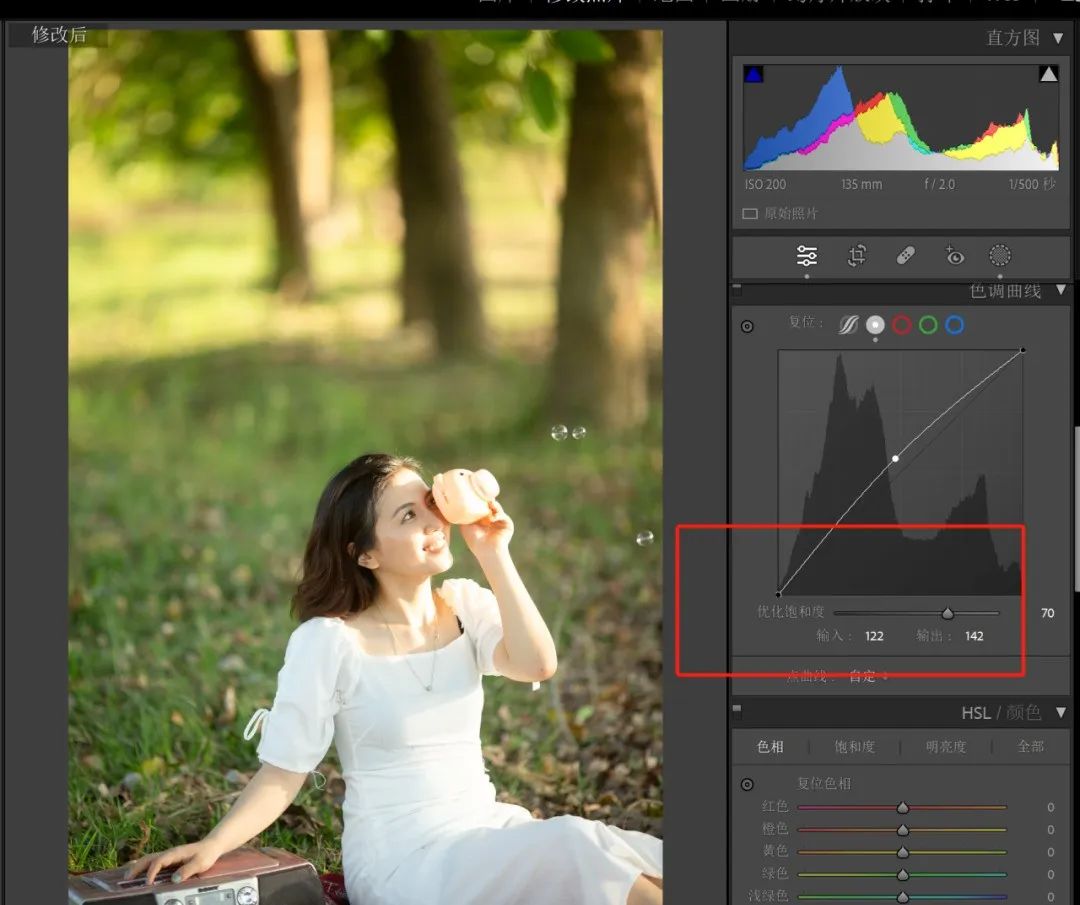 在点曲线的下方,新增了“优化饱和度”滑块。用曲线调整照片明暗的时候,可以微调色彩的饱和度。