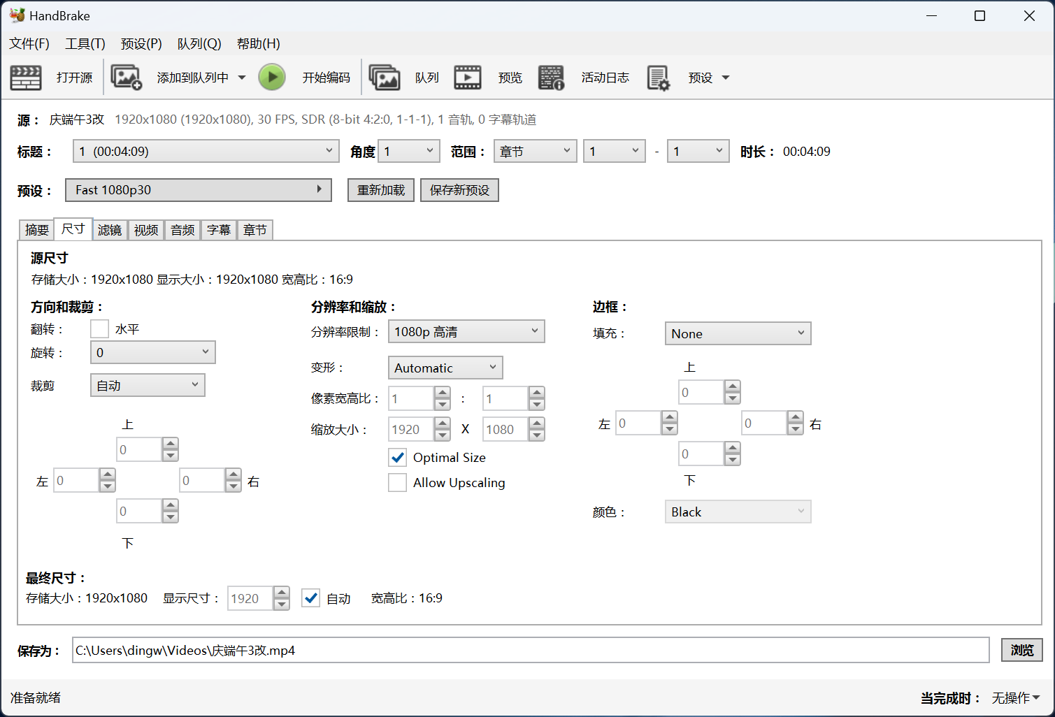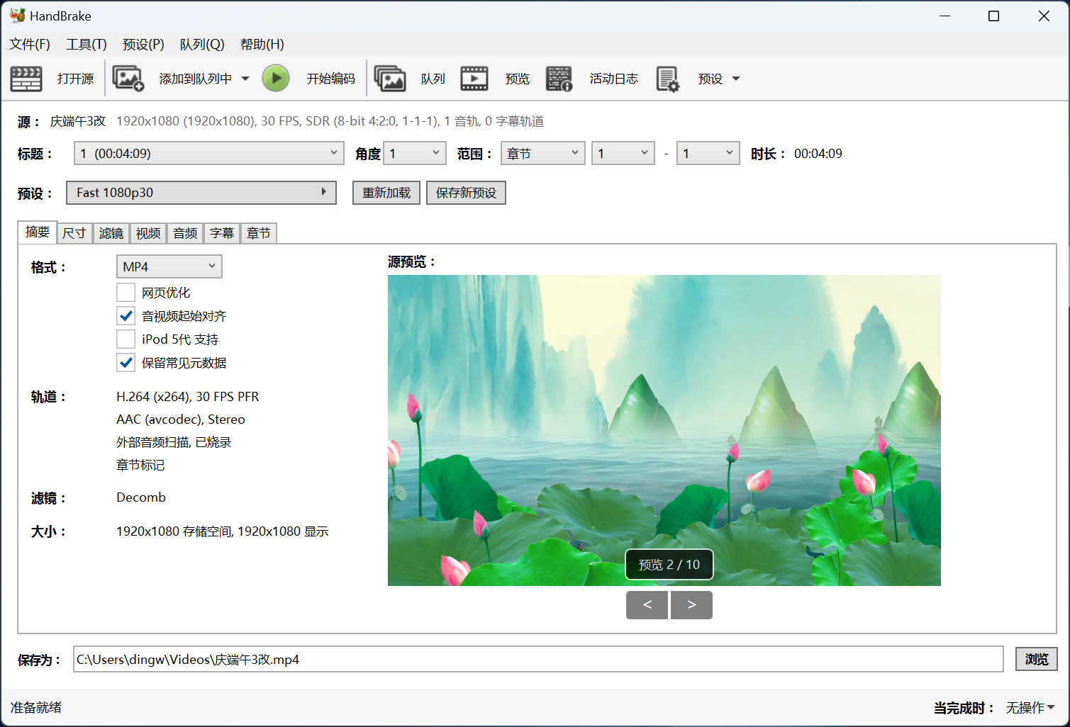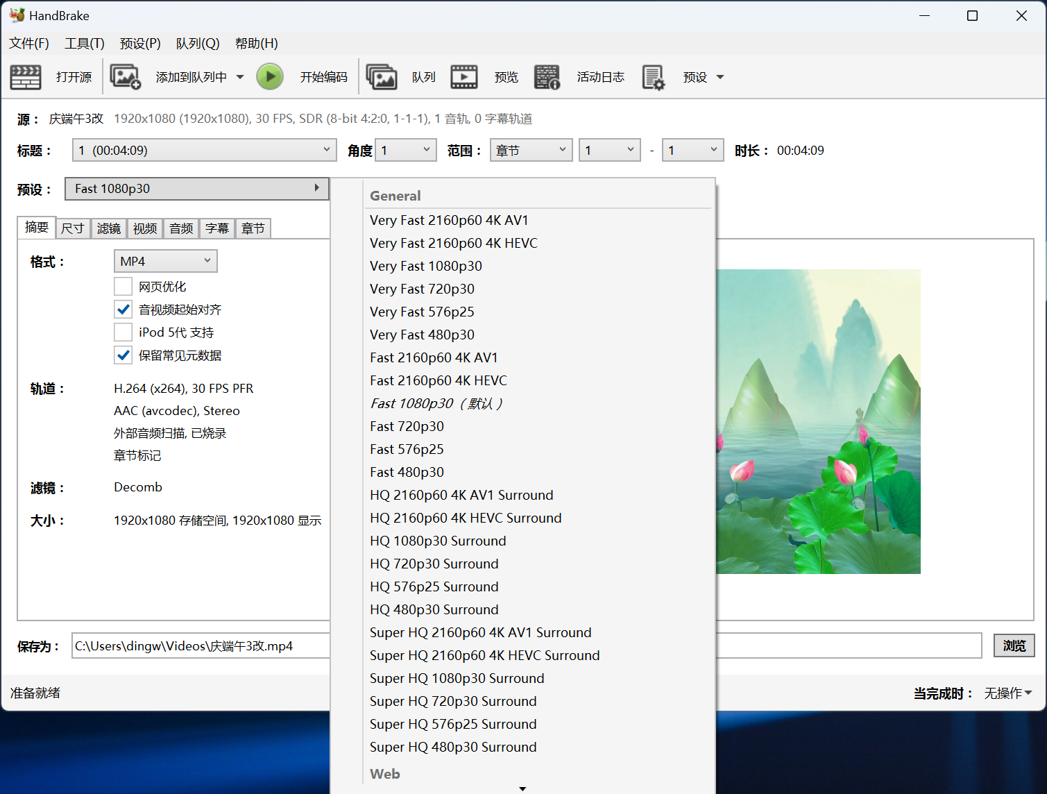 4. 오른쪽 영역은 일반적으로 사용되는 모드입니다. 소프트웨어는 기본적으로 fast1080P30으로 설정되어 있습니다. 이 기본값은 좋으며 일반적으로 변경할 필요가 없습니다. 소스 파일을 추가한 후, Brose 버튼을 선택하여 파일을 저장할 위치를 찾고, 저장할 파일 이름을 입력한 후 확인을 클릭합니다.
