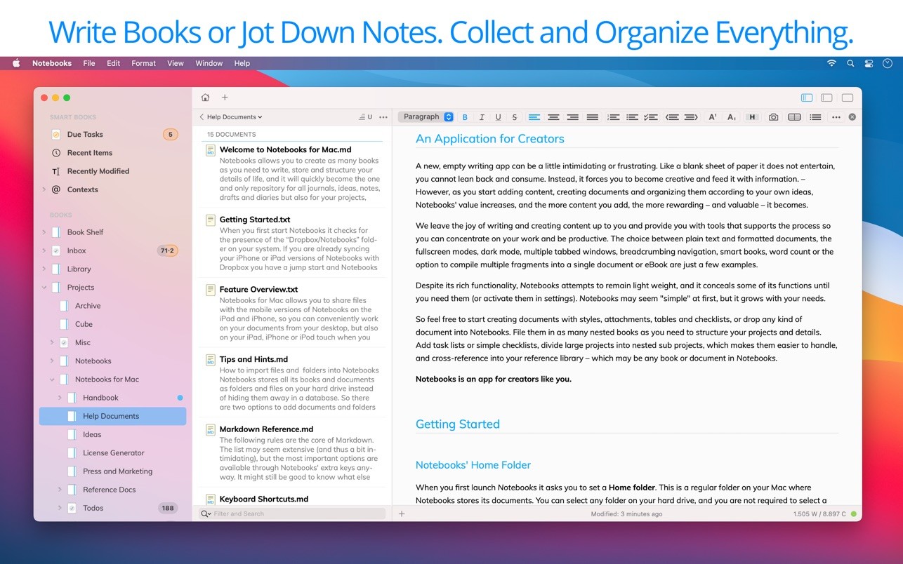 Notebooks for Mac 是一款专为个人和专业用途而设计的笔记和书写应用程序。它允许用户在单个应用程序中创建、组织和管理笔记、文档、任务和项目。Notebooks 支持各种类型的内容,包括文本、图像、PDF、网络剪辑、音频和视频文件。