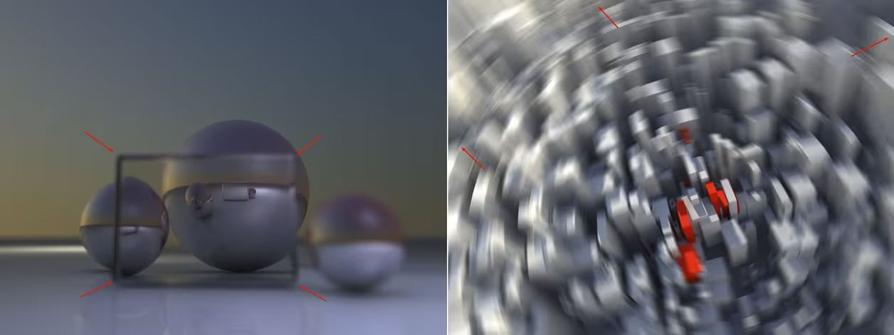 Стеклянный куб расположен перед несколькими сферами. Сам куб размыт. Однако отражения сфер за ним остаются в фокусе. Если применить 2D-эффект, карта глубины которого не содержит информации об объектах за прозрачностью, всё, что находится за стеклянным кубом, будет размыто.