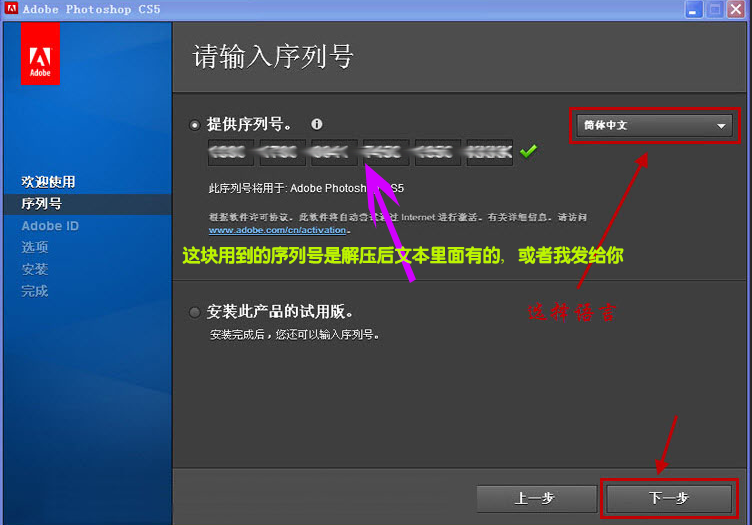 第四步:填好软件包内含的序列号,选择好语言 下一步