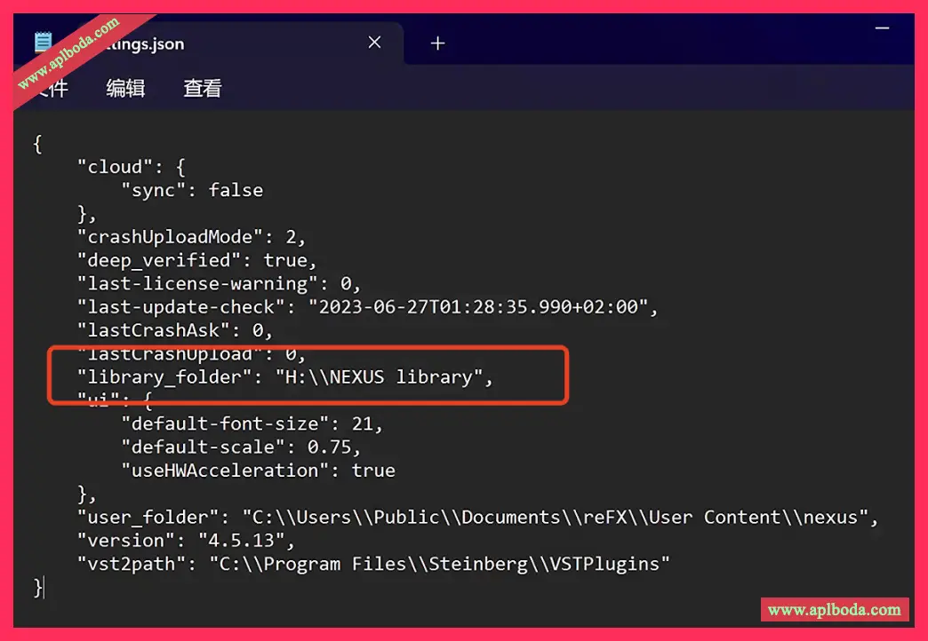 4. 修改settings.json文件里的音色库路径,先确定你音色库路径,进入NEXUS library里,任意右键选中其中一个文件夹,显示界面,在位置那里右键点击下,拷贝为路径名称;